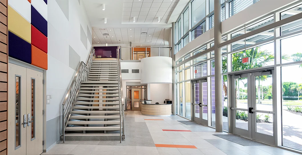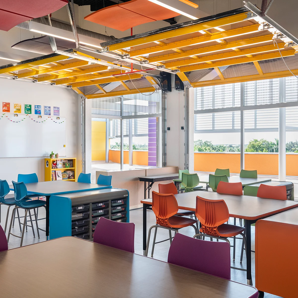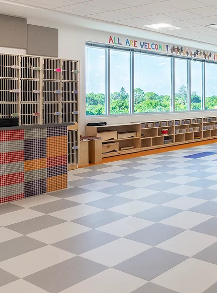 In addition to classroom space, the colorful building has a large multipurpose room with a capacity to serve meals for 180 students. The building has music and art labs designed with access to an outdoor roof terrace to encourage arts exploration and interaction with the environment. The terrace also hosts the aquaponics and hydroponics gardens. An outdoor play pavilion is included as part of the design for PE activities. All classrooms have been designed with natural light, flexibility and technology in mind.