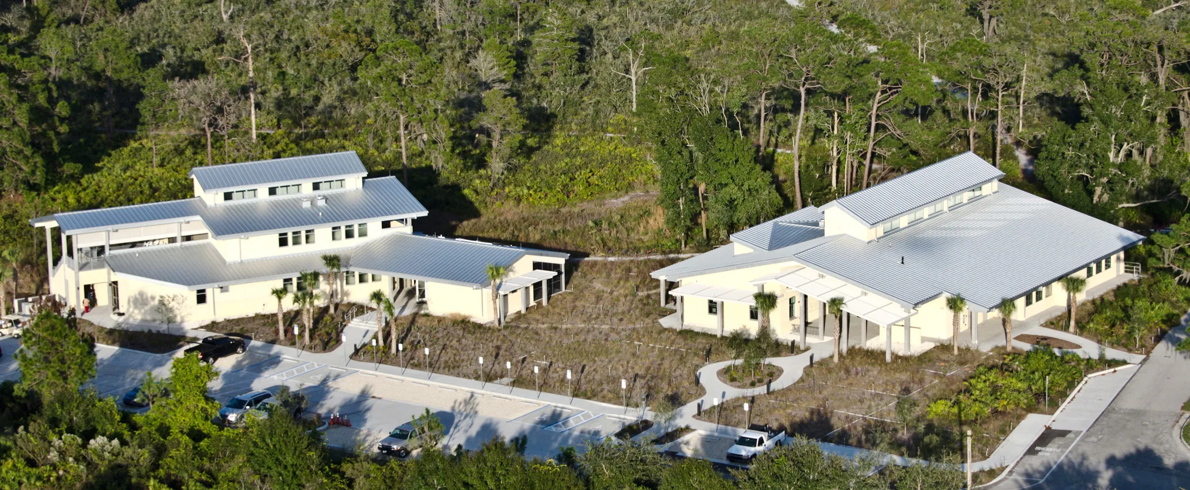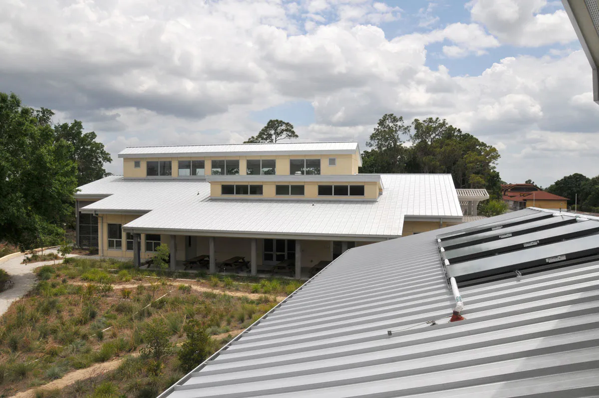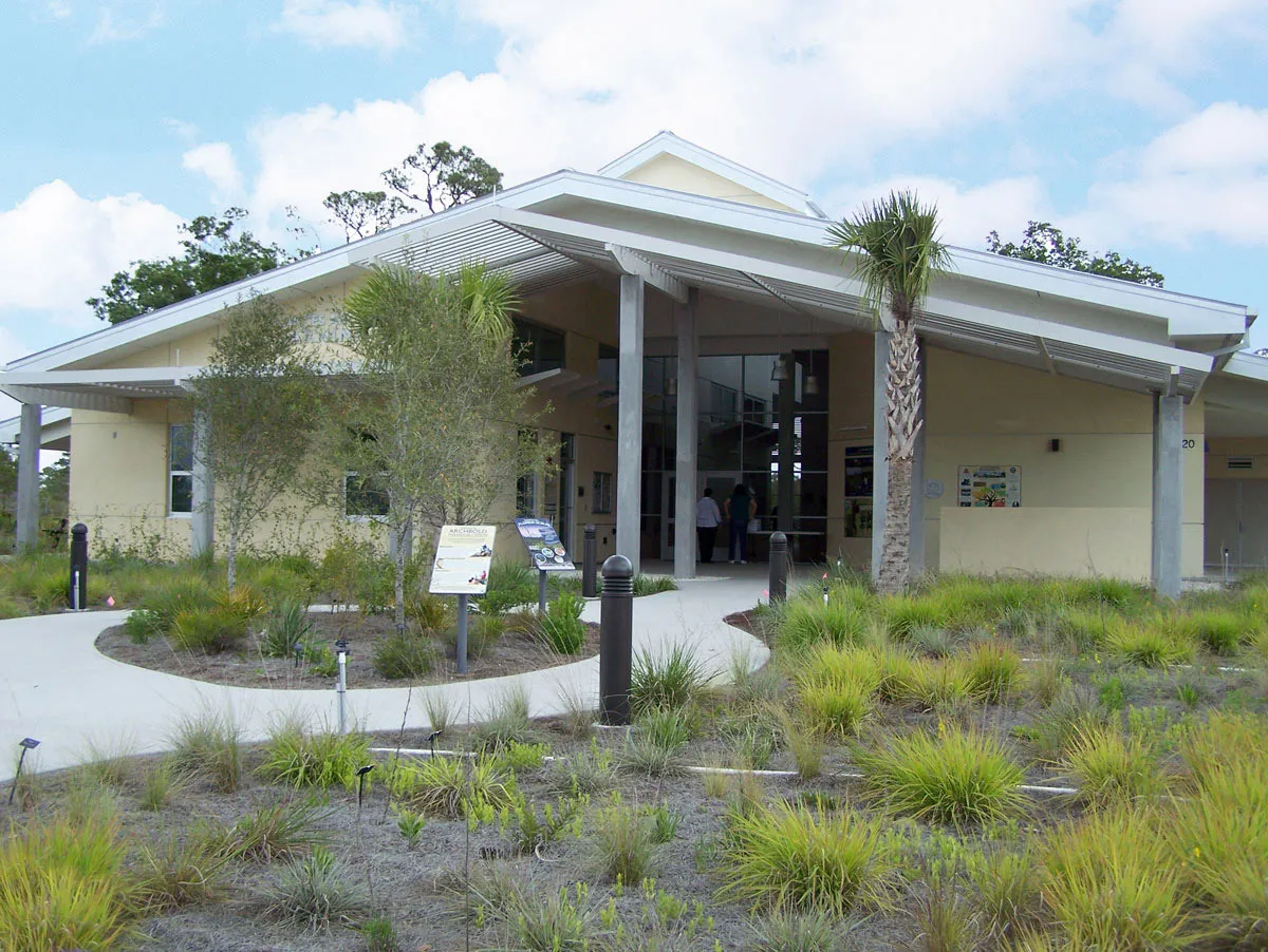 A proud recipient of a LEED Platinum Certification, the project was designed to integrate the outdoors with the indoors, the Learning Center is approximately 5,700 sq. ft. in size, with an additional 3,700 sq. ft. of partially screened, outdoor covered space. It consists of several smaller structures under one over arching roof, housing two meeting rooms, public restrooms, Education Department office, a permanent K-12 educational exhibit/interpretive display area, informational kiosks, and a lobby which functions as an additional venue for social events. The Lodge is a 2-story facility, 5,100 sq. ft. in size, with 2,500 sq. ft. of decking, containing 14 rooms with the capacity to sleep up to 41 guests. A separate Lobby/Lounge in the building is for small meetings, studying or simply relaxing after a day of fieldwork. This project was constructed using as much environmentally safe and conservative construction as possible to include an extensive rainwater harvesting system and underground cistern providing 80% of the water needed for restroom facilities and clothes washing. The project was constructed on an Environmentally Sensitive Site on one of the largest remaining areas of endangered Florida scrub ecosystem. The site is a National Natural Landmark and the Station is on the National Register of Historic Places.