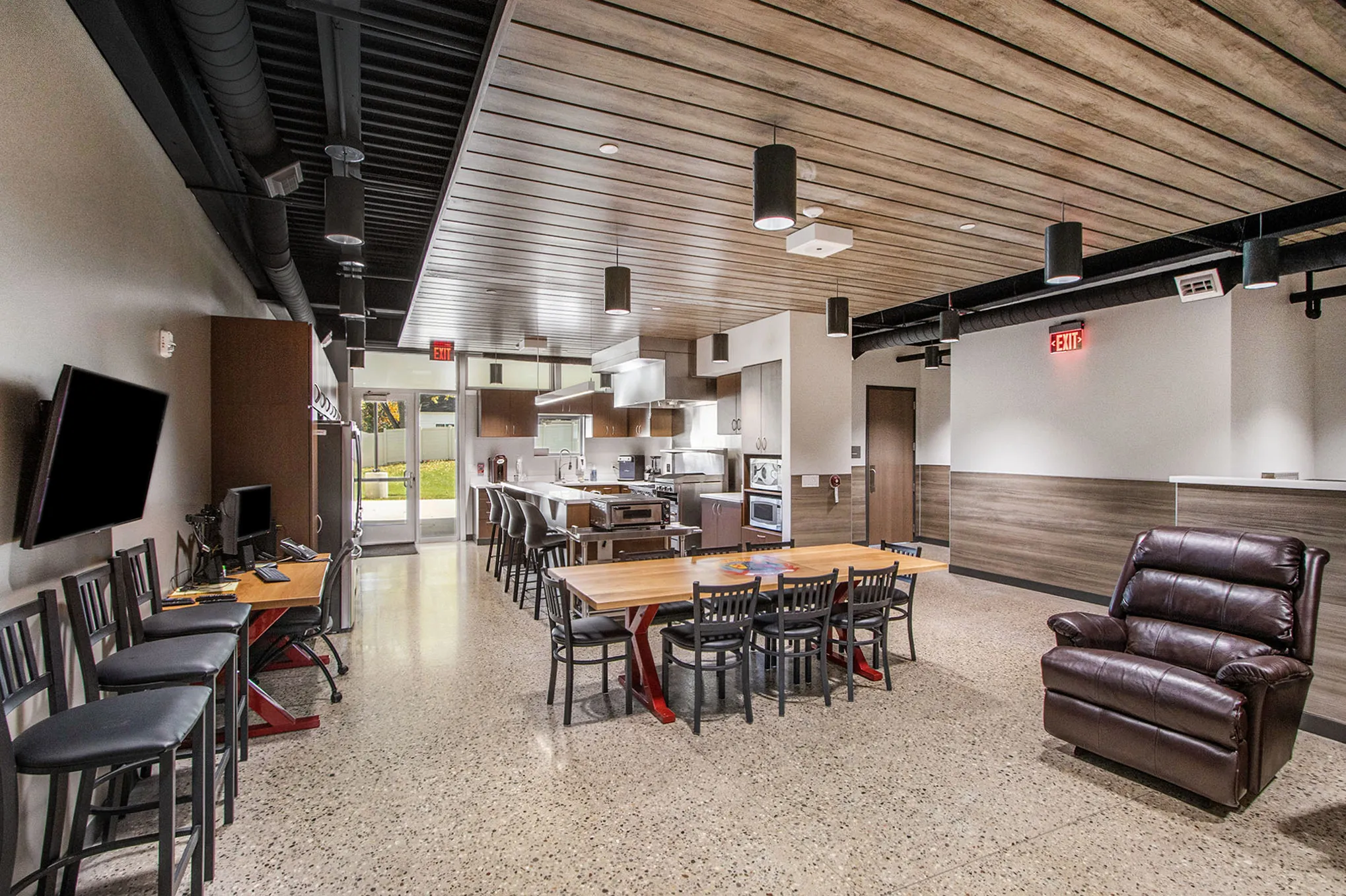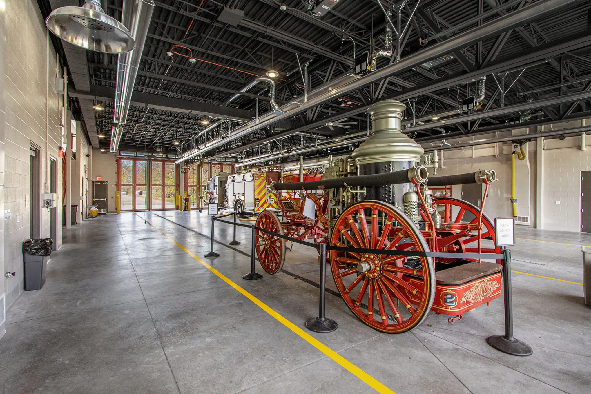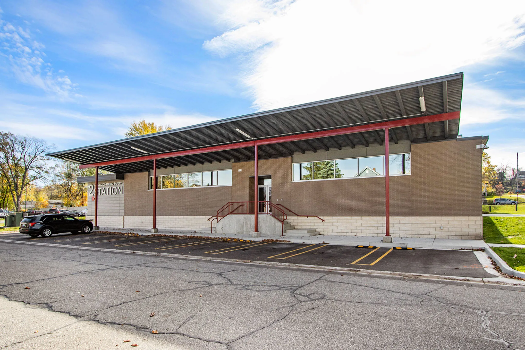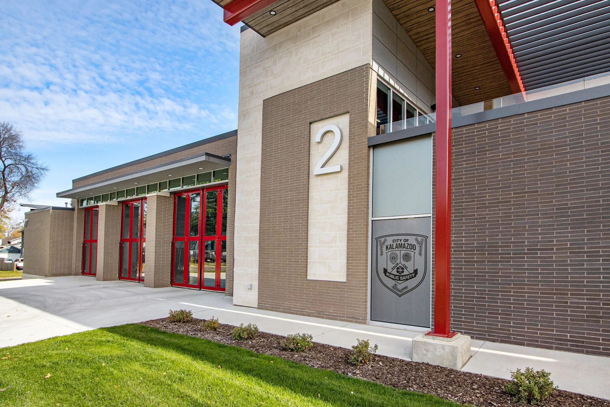 This new public safety station replaces a former fire station, which was originally constructed in 1952. The new station brings together the police and fire departments, separated by a truck bay. Other features include a multipurpose community space that doubles as a training room, a full-service kitchen, sleeping areas, laundry rooms, a fitness room, locker rooms, a lounge area, an enclosed terrace and courtyard, and covered parking for patrol cars. The construction of the building incorporated many sustainable elements, which led it to achieve LEED Silver certification.