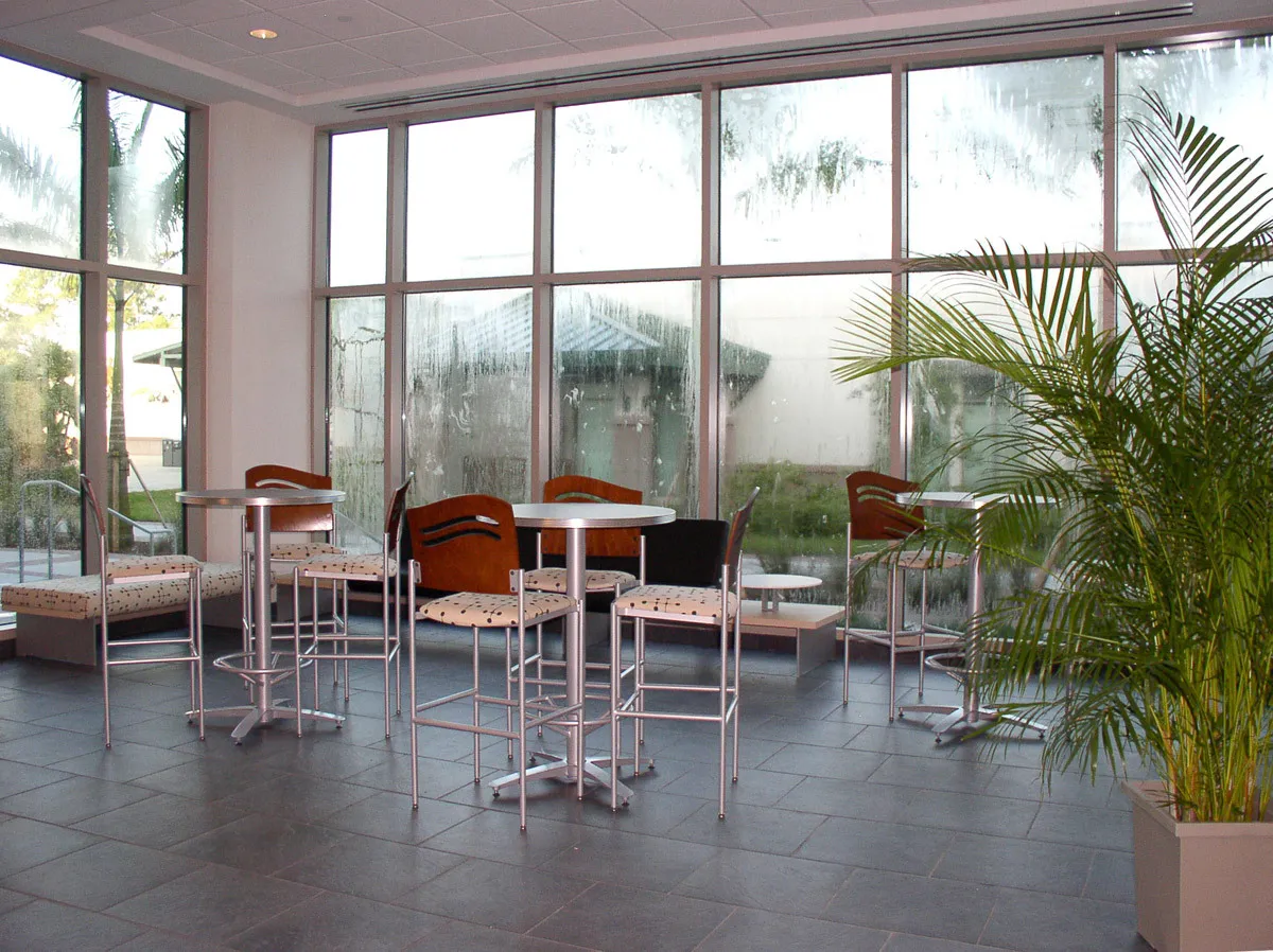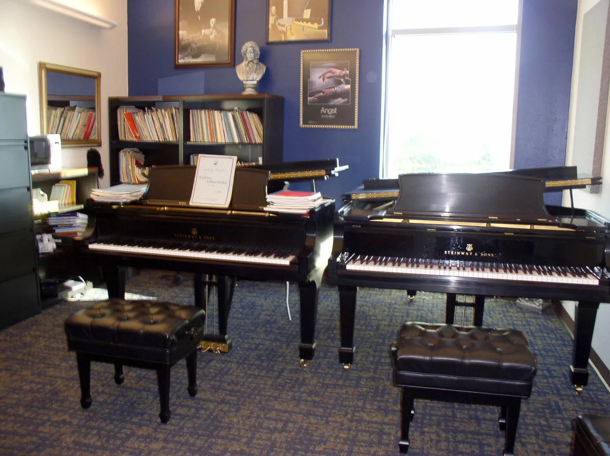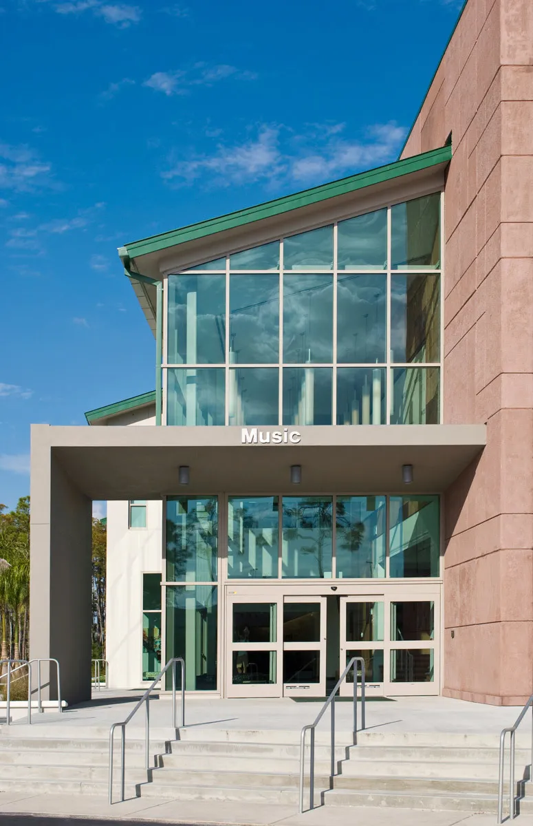LEED Gold Certification was obtained for this facility by incorporating elements such as bamboo practice hall and recital stage flooring with origami walls, specialized lighting, paints, electrical and mechanical placement, and a Safe room with key card exit. Another design element used is the specialized flooring in classrooms, such as bamboo, patterned tile to resemble piano keys, and “floating floors” for acoustical quality. The Performance and Recital Halls have octagonal-shaped acoustical wall coverings and the 3,000 sq. ft. Rehearsal Hall has an octagonal shaped ceiling for optimal acoustical quality. Acoustical wall and ceiling paneling is also located in practice rooms and facility studios. There are also STC rated walls and doors in practice and classrooms. In the 1,000 sq. ft. Grand Lobby, wood panels and a commemorative wall engraved by a local artisan highlight the entry. Along with the 3,260 sq. ft., 196 seat recital hall, there is a 15 student technology laboratory, a 12 student keyboard laboratory, 10 student practice rooms for independent instrumental/vocal study (two rooms for percussion, two rooms with grand pianos and six rooms with upright pianos).