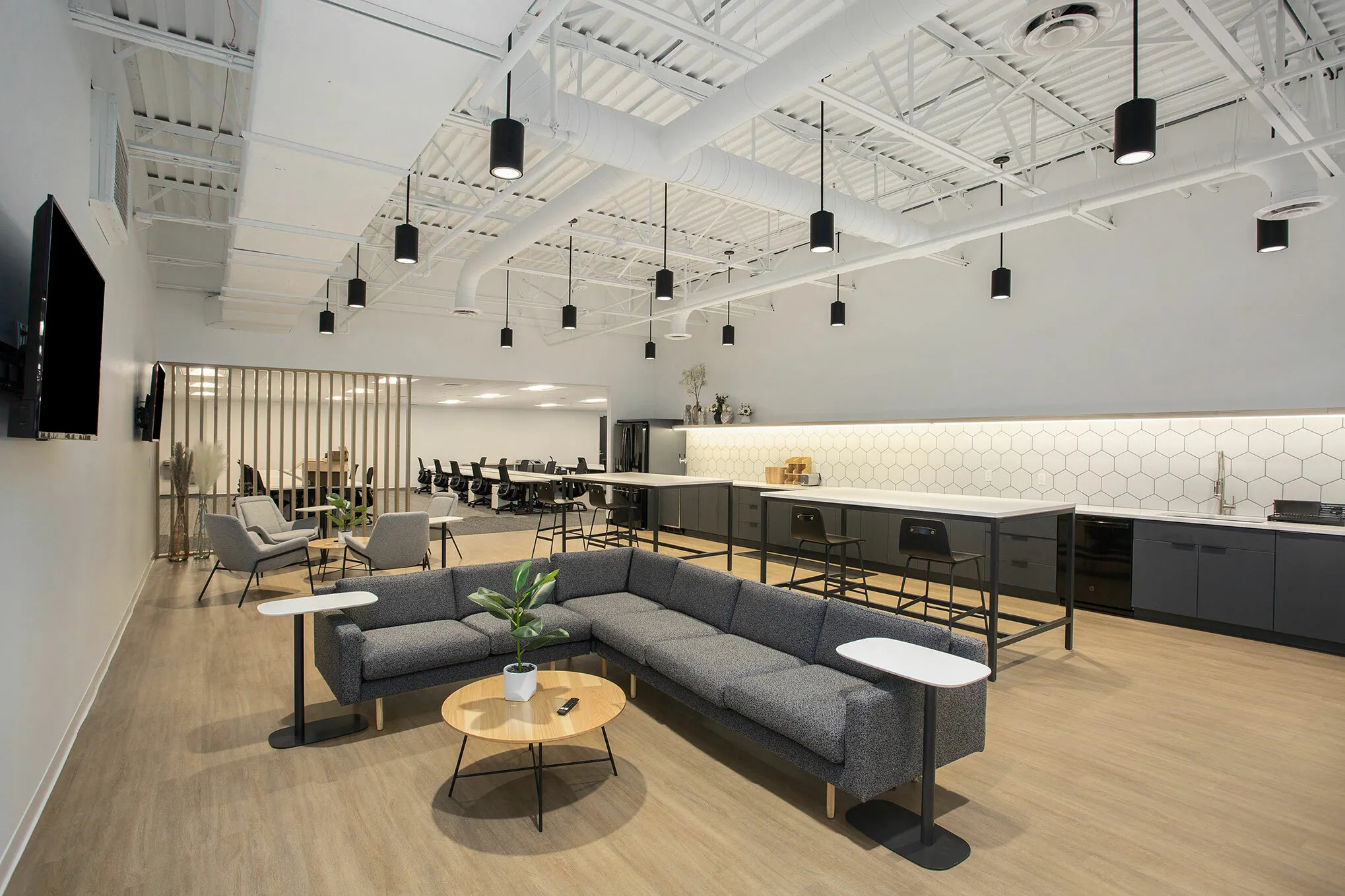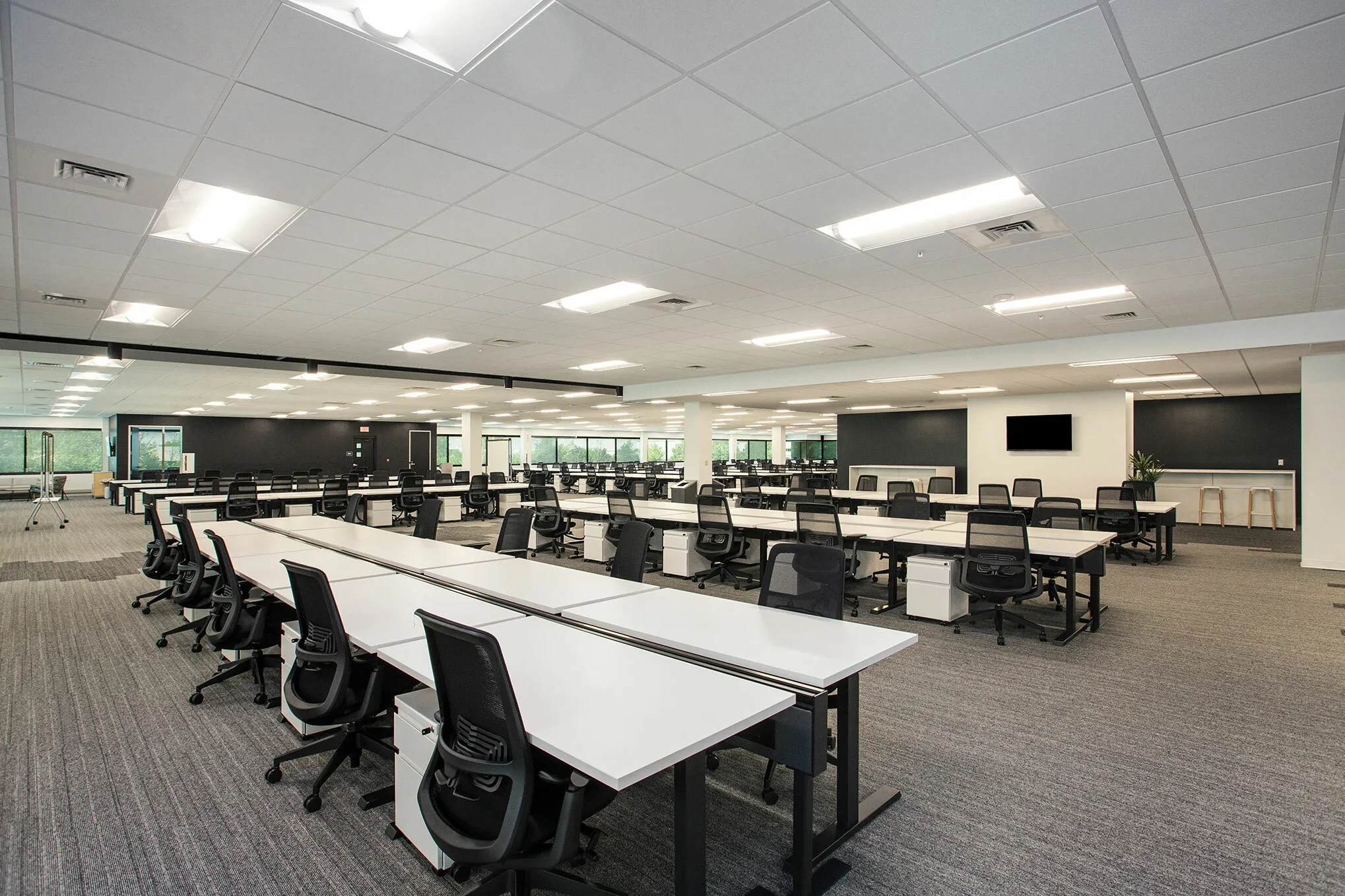 Existing design elements, such as light fixtures, doors and ceiling tiles, were all utilized to complement the new light and airy workspace, while custom design features, such as flexible seating arrangements, new flooring, countertops and casework, were carefully integrated to ensure a contemporary design that maximizes space and optimizes workflow.