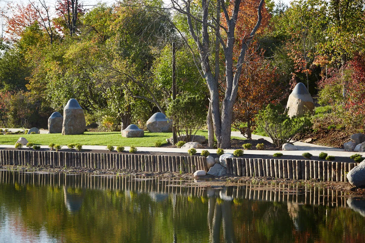 The Richard & Helen DeVos Japanese Garden is the most recent addition to Meijer Gardens, which opened in June 2015. The eight and a half-acre project, designed by Hoichi Kurisu, features traditional components such as waterfalls, elevation changes, extensive boulder placement, authentic Japanese structures and a functioning teahouse. The Japanese Garden, located in the middle of the campus, embraces the essence of traditional Japanese gardens—tranquility, contemplation and beauty while incorporating Contemporary sculpture by international artists. The design effectively uses space to highlight contrasts between still and rushing water, between quietly intimate spaces and expansive open spaces, and between manicured and natural areas.