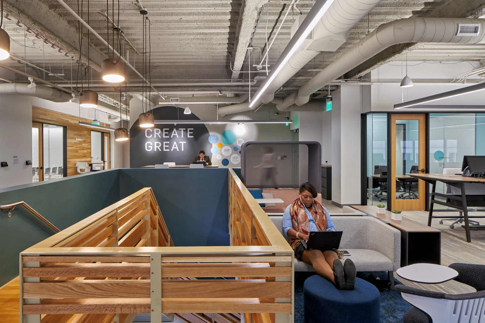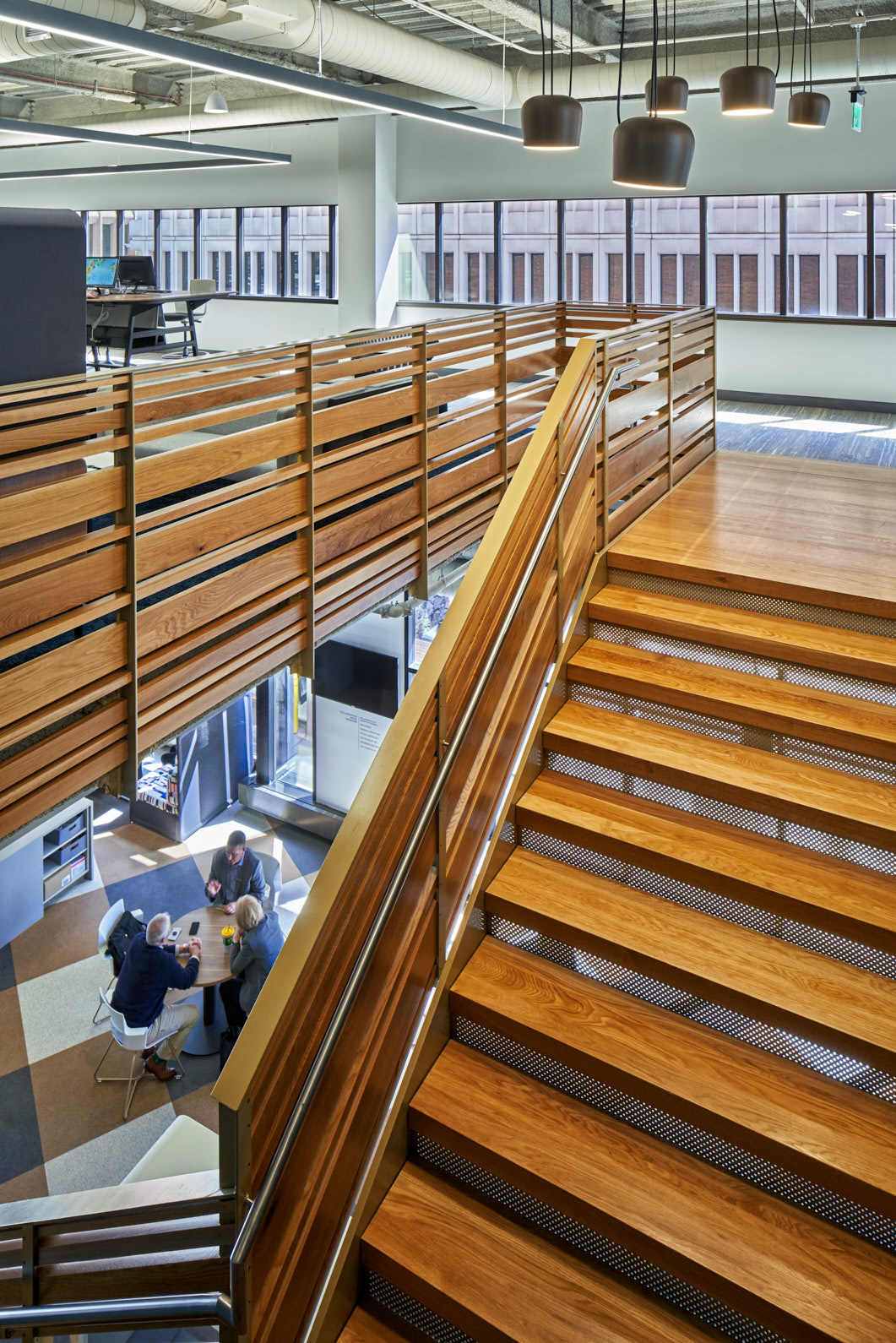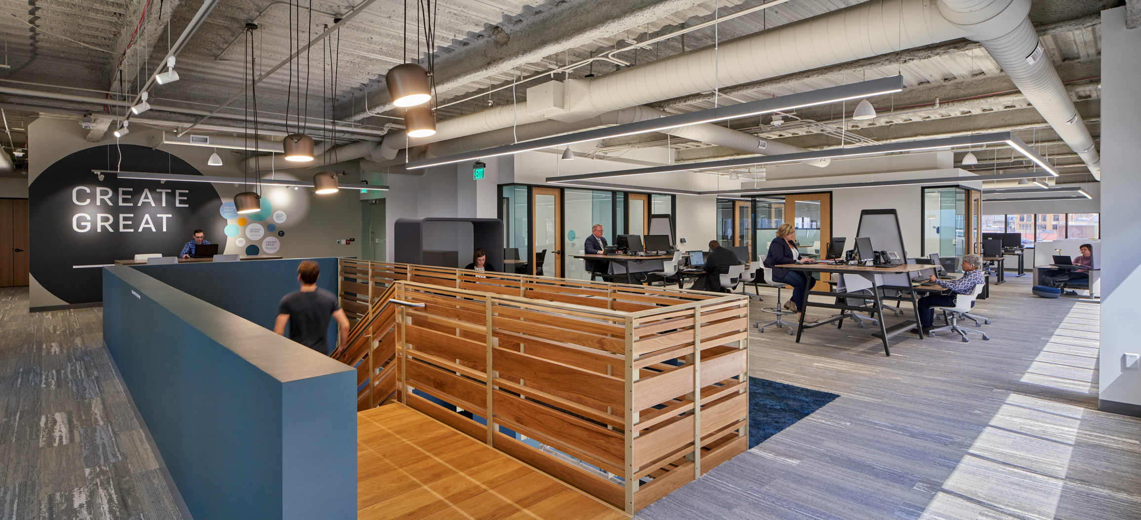 The 11,000 sf build-out is located in the 250 Monroe building in downtown Grand Rapids. Construction challenges included a new staircase in the center of the office, connecting the first and second floors, and an aggressive 12-week timeline during the holiday months, from November 2017 to March 2018. 30% of trades were performed by women and minority-owned businesses.