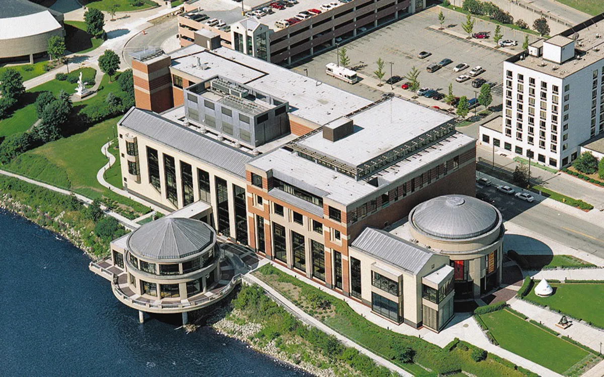 Construction features include a carousel pavilion extending out over the river which required sheet piling, gravel support base and a scaffolding system to temporarily support a weight of over 2.5 million pounds, and a computer-programmed temperature control system with humidity-sensitive sensors for irreplaceable exhibits.