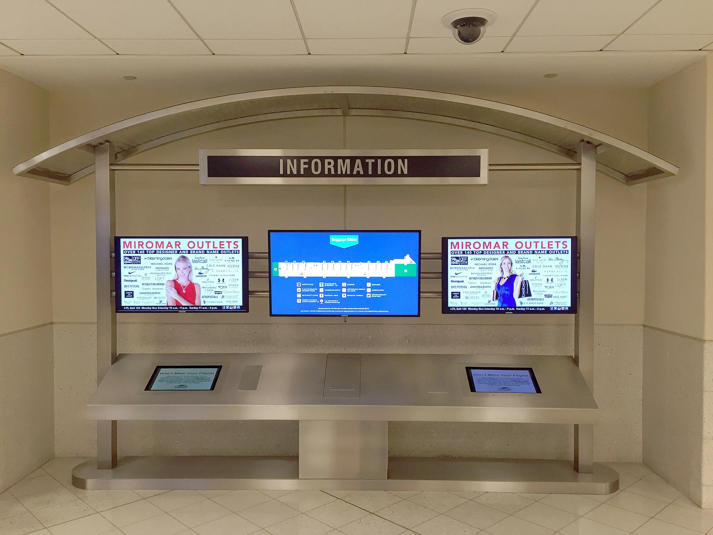 The FIDS (Flight Information Display Screens) Improvement project replaced static displays with high definition digital signs, replaced scrolling advertising signs with LCD video walls, adding big-screen video walls throughout the terminal, new LED signs for the baggage area and installing standing wall and seat charging stations.