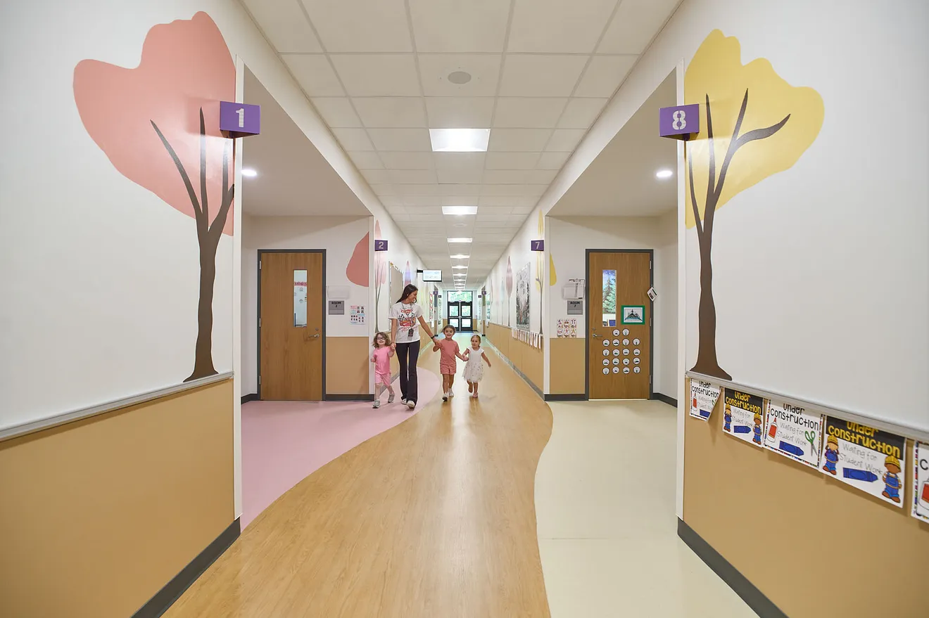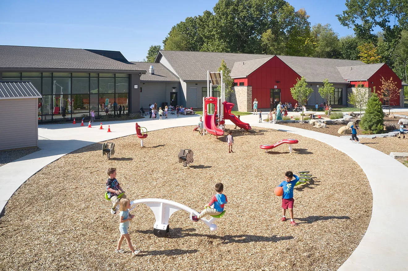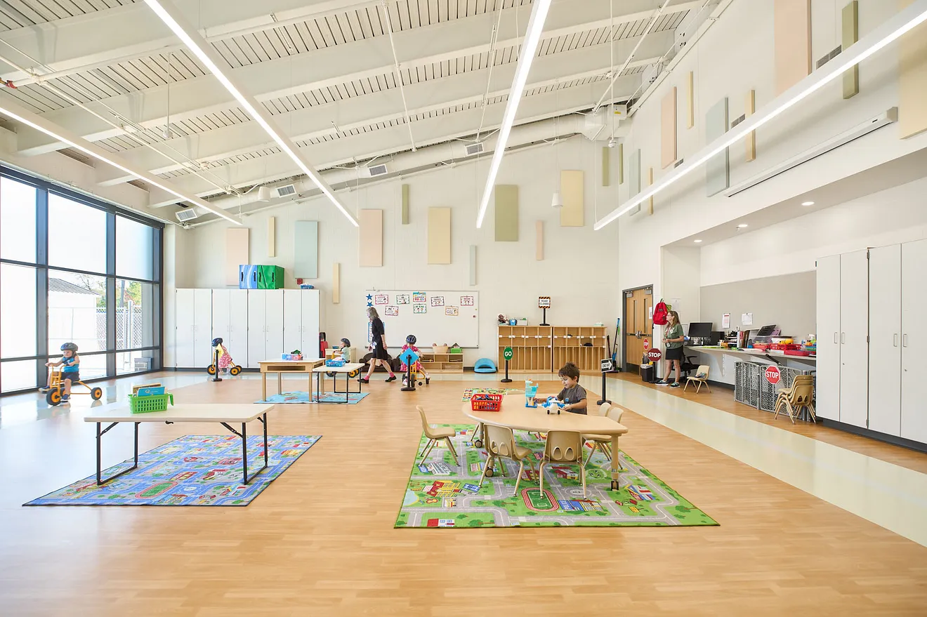 This 17,555-square-foot Early Childhood Center was designed to support early learning for primarily four-year-olds, along with some three-year-olds. The facility features eight classrooms arranged in pairs, each sharing mudrooms and student restrooms with direct access to an outdoor playground. A dedicated Gross Motor Room offers a tricycle track and open space for active play, encouraging physical development and movement-based learning. The project also includes a new playground as part of the site development.