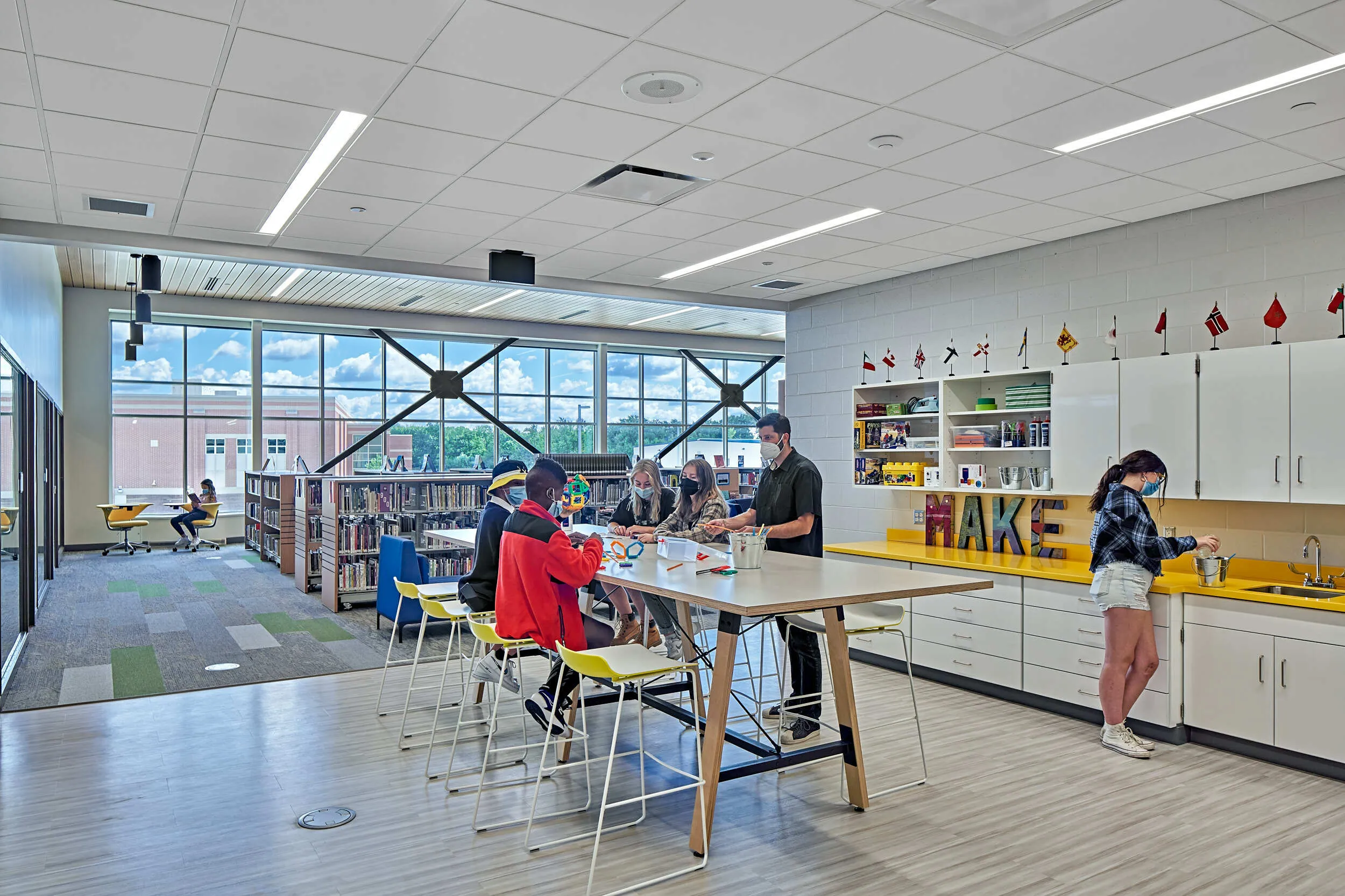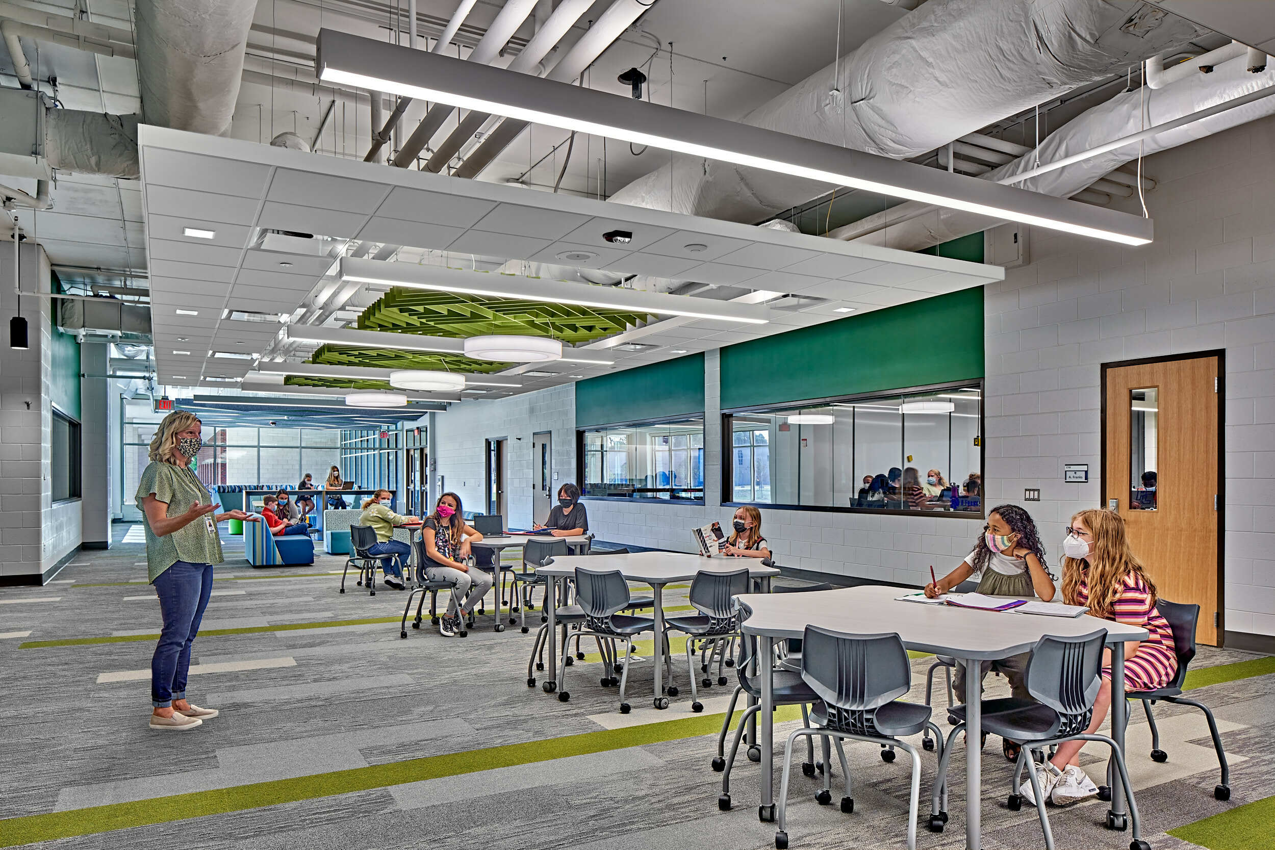 This new 144,800 sf middle school project features a four-story design, 21st-century classrooms and learning laboratories, high-end finishes like polished concrete and custom wood ceilings, and state-of-the art technology and security.