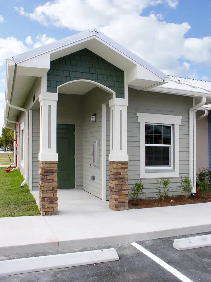 The new construction project includes two one-story four-unit multifamily residential buildings with 2 two-bedroom and 2 one-bedroom units per building. Each unit has a private lanai, kitchen with all appliances, hurricane safe windows throughout, attractive cultured stone applied around each entry column base and fire extinguishers inside and outside of each unit. Solar panels supply hot water to all the units as well as the energy to run the pumps and the standing seam roof is hurricane resistant and energy efficient with the insulation applied directly to the underside of the roof. One of the 2 bedroom units in each building is fully ADA compliant including audio/visual alert system.