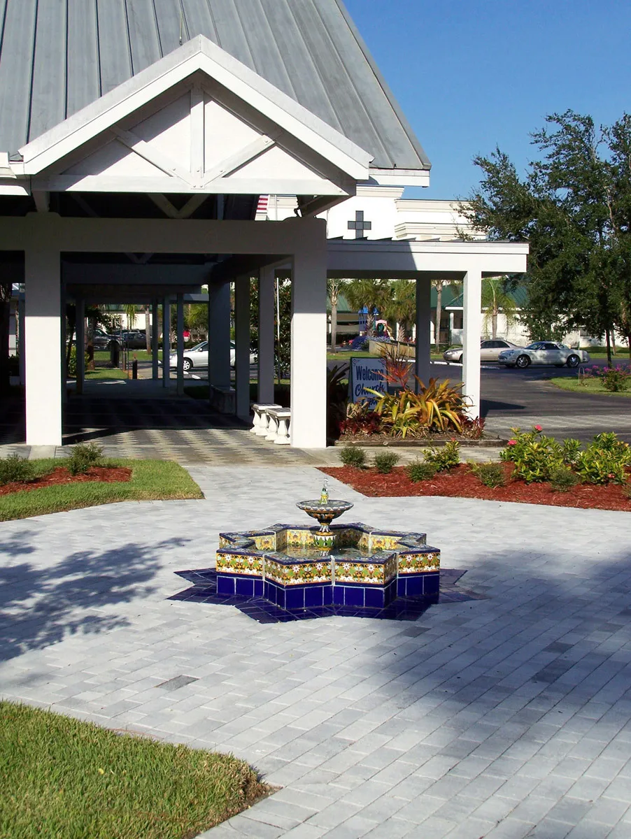 The two phased project kept the church open during entire construction period. A new memorial garden shelter was built with tile flooring and a 12’ wooden cross was erected, constructed from hard wood by one of the parishioniers. The south side of chancel was remodeled, to include new larger windows for a better view of the new prayer garden. Brick pathways leading to memorial shelter which includes a labyrinth, a 6’ Italian marble statue of Mary, semi-private prayer areas with benches and a mosaic fountain built in Jerusalem. The project provided new landscaping at garden shelter and along pathways, extensive custom tile and brick work and a new roadside entrance sign.