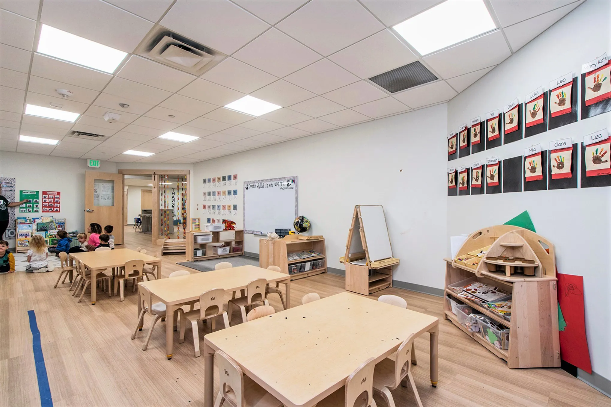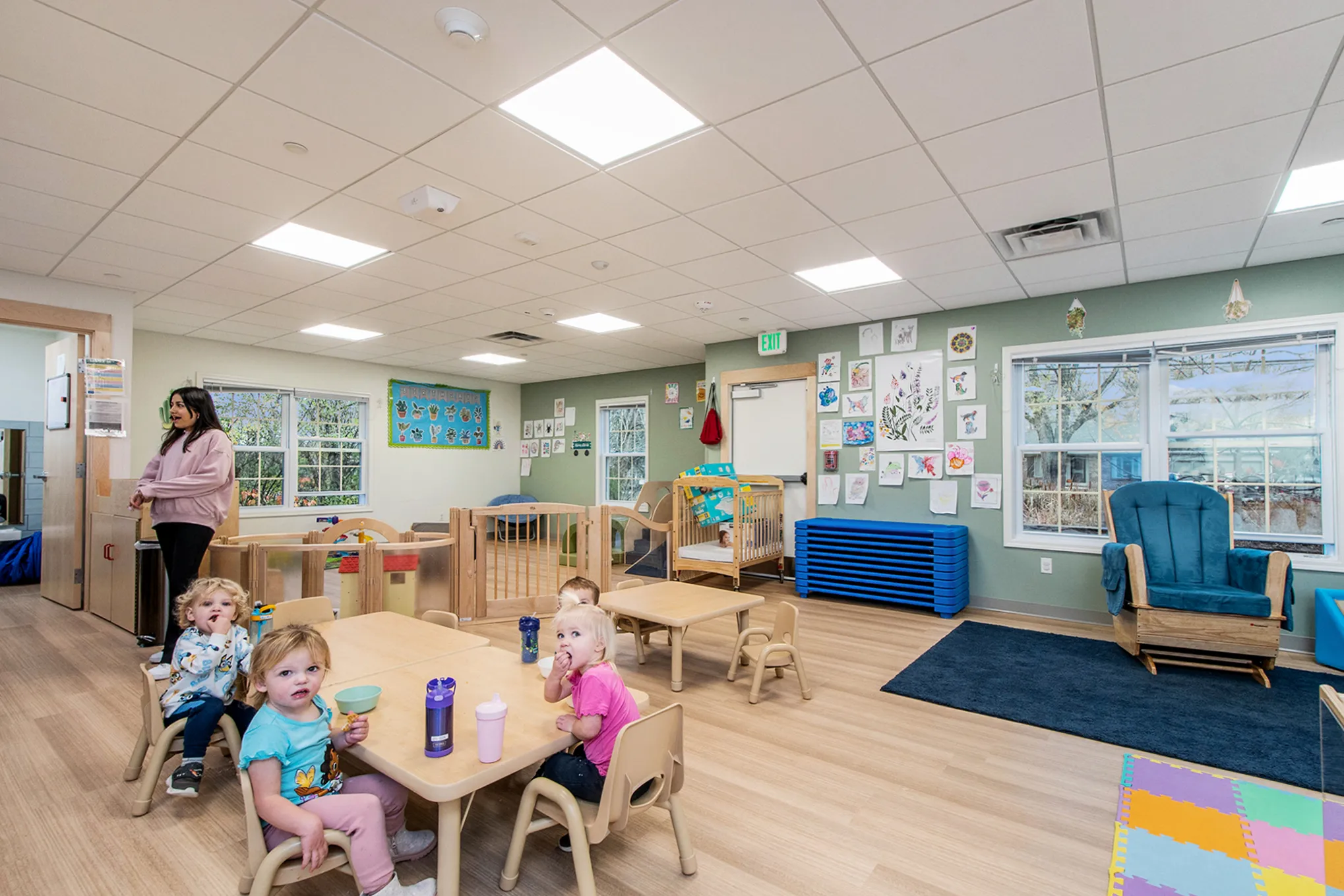 The project included interior renovations of classrooms and bathrooms, a gathering area for activities and events, and an office for the early childhood director. It also included an outdoor play area and a vestibule for parent drop-off, improving the parking and drop-off flow of the campus.
