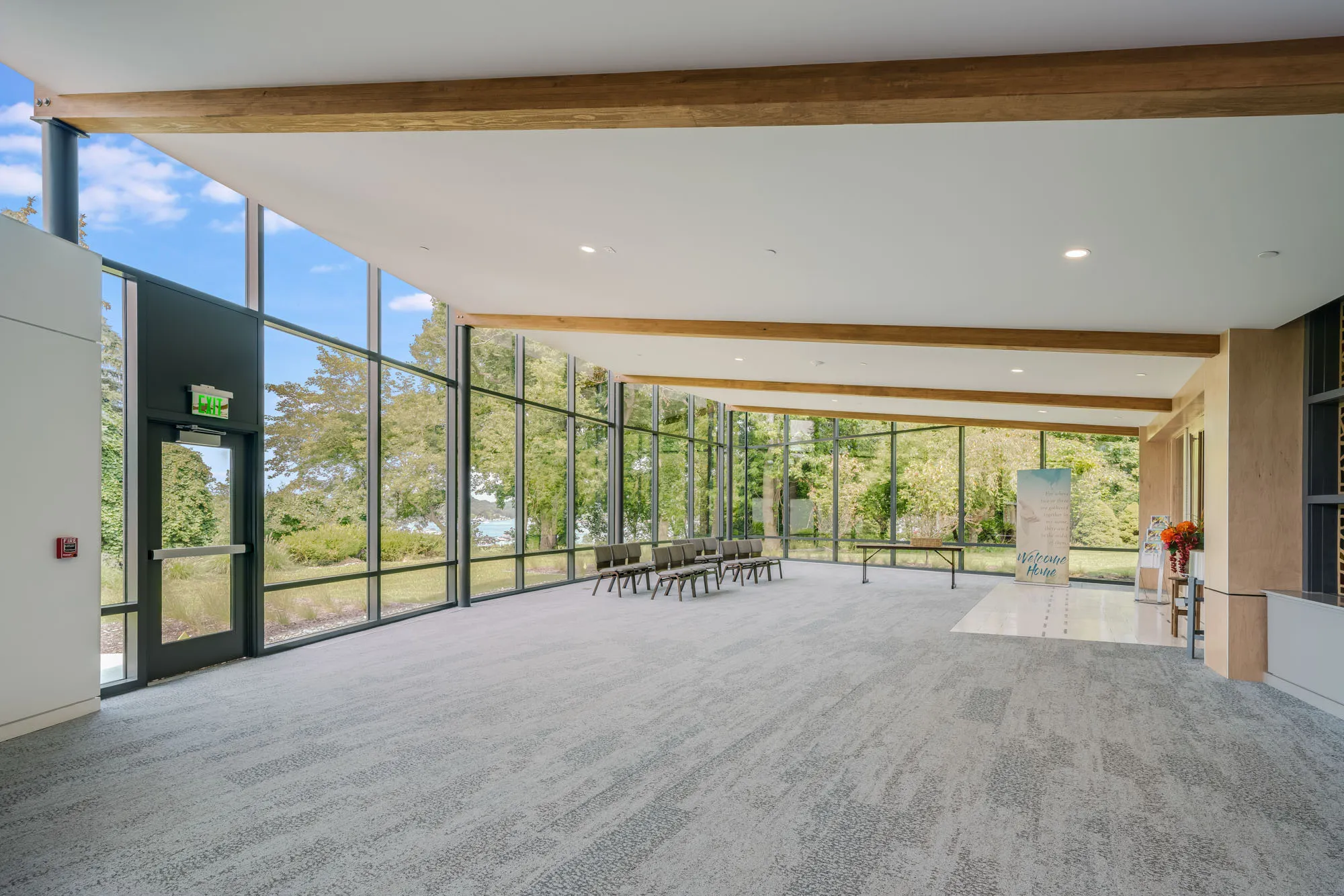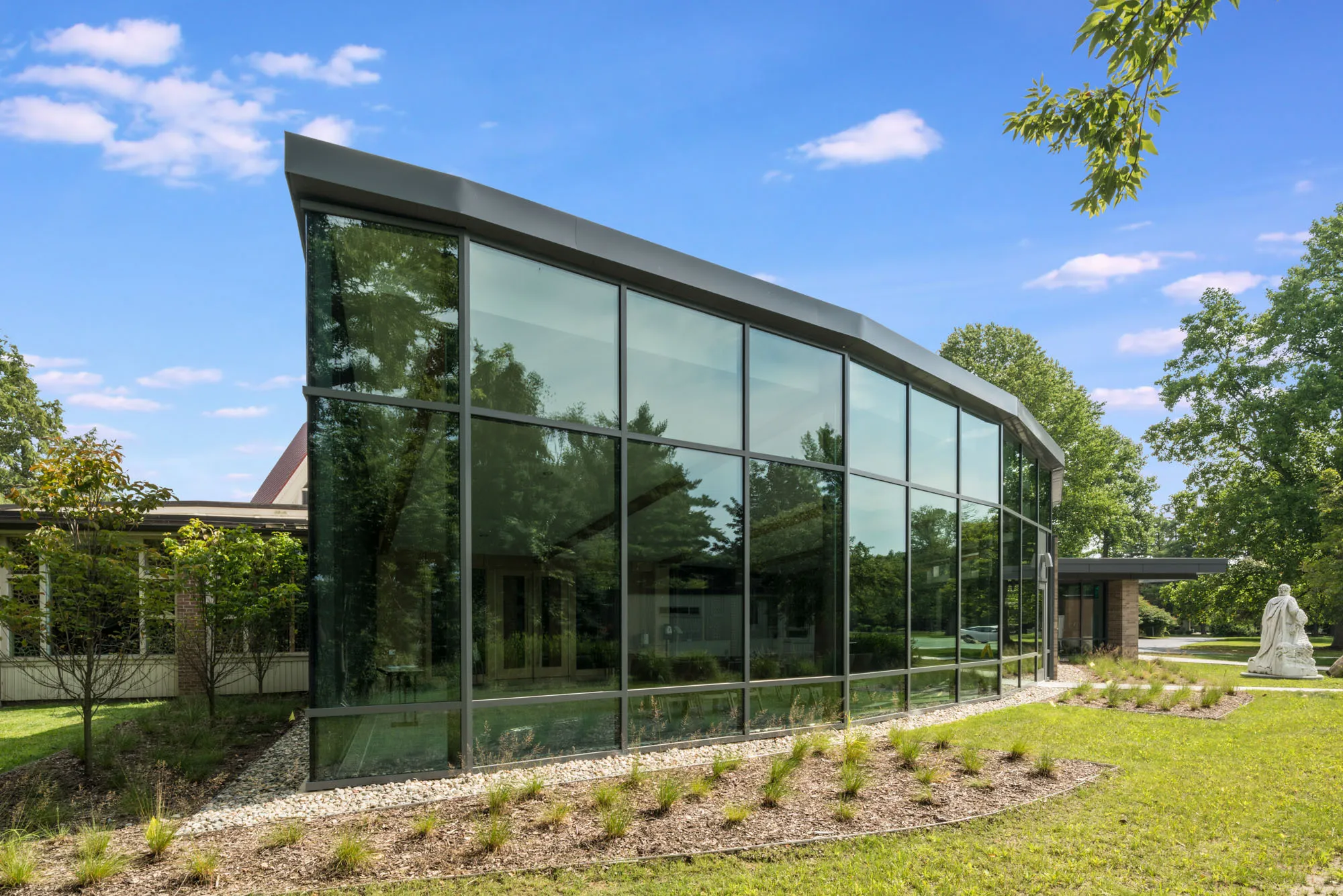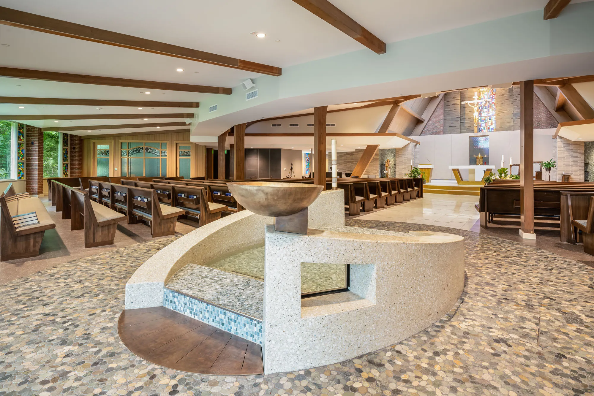 The exterior features a new entry and outdoor landscaping to allow for a more functional outdoor space to pray, meditate, and enjoy the serene view of Kalamazoo Lake. This space includes the large statue of the patron Saint Peter.