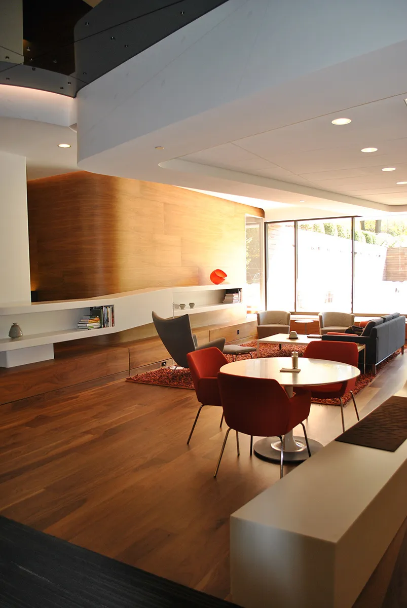 The new space connects to the main entryway of the headquarters building with a matte-finish walnut stairway and white honeycomb ceiling styling feature. A casual lounge setting sits just off the stairway, where a concierge is available to help employees reserve rooms or schedule various events. More casual space is available in the “living room” area, which the company stocks with periodicals and books.