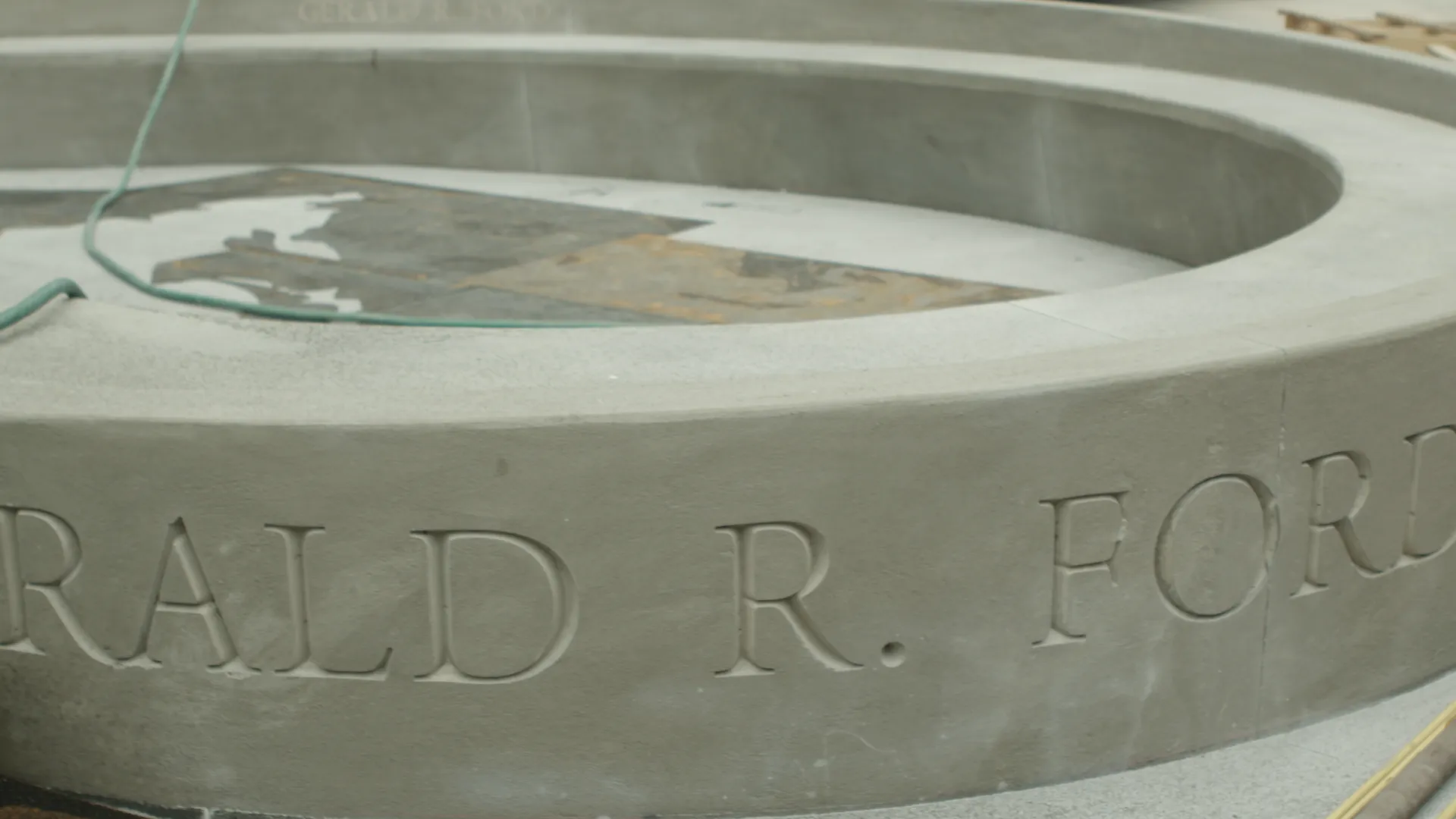 O‑A‑K has completed another exciting project with Gerald R. Ford International Airport under our master service agreement. This project serves as the centerpiece of the main terminal entrance at the airport. The bench was made with concrete that mimics the look of limestone. This look is achieved by a difficult rubbing process that is challenging to achieve when using only concrete. The bench features a larger-than-life statue of Gerald R. Ford sculpted by J. Brett Grill. The spiral bench also features bronze inlaid lettering which reads "the 38th President of the United States" and "Gerald R. Ford" and the statue is set in-between the two phrases. Another unique component of this iconic centerpiece is that it includes the world map which was sandblasted into the base of the bench.