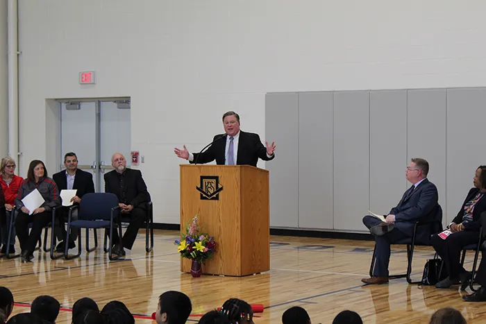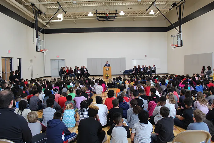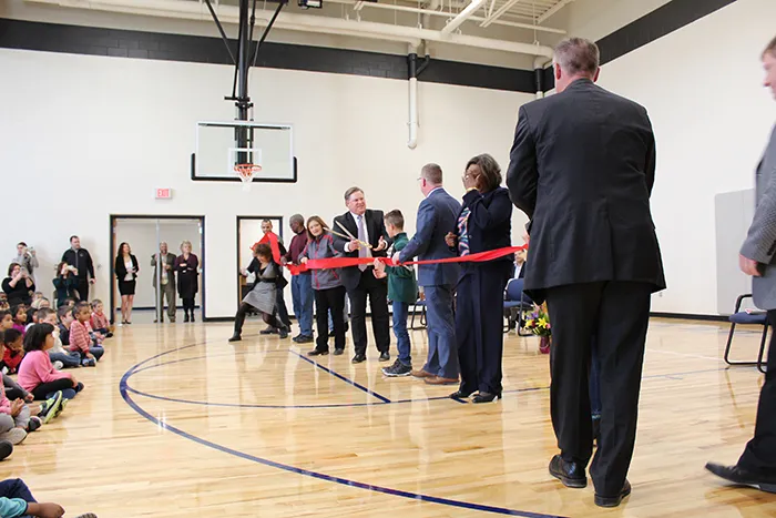 Students, school officials and project partners gathered Friday afternoon to celebrate the completion of an 8,600 square foot gymnasium and kitchen building expansion at Meadowlawn Elementary School. The construction project marks a major milestone in the district’s $64.8 million bond program, passed by voters in 2015.