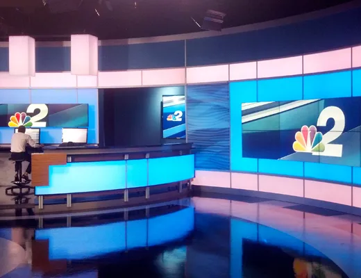 Interior improvements included a renovated lobby with new staircase and elevator, a new studio, an open-plan newsroom, edit booths, a new videographers’ office, green rooms, office space, an employee break room and restrooms. The project also included improved power, HVAC and fire suppression systems and a renovation of the former studio space for production and marketing staff.