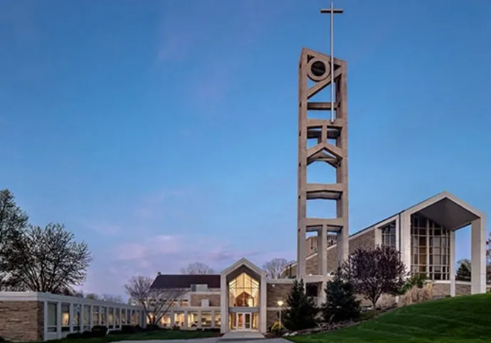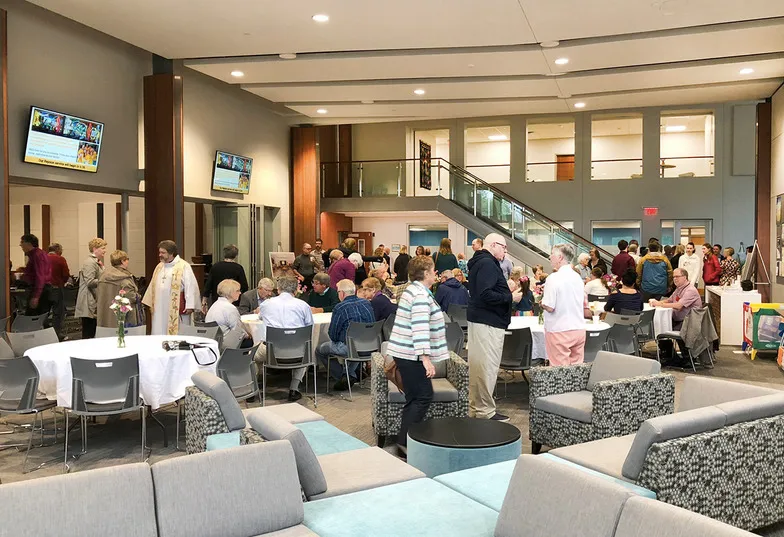 The design intent for the fellowship addition was to unify an evolving congregation that supports multiple worship styles and generations. Formerly a lower-level courtyard, the new 3,000 square-foot fellowship space features cathedral ceilings with clerestory windows, a central glass-paneled staircase leading to the main floor, and an open wall connecting to the contemporary worship area, known as the church’s “Rejoice Worship Center.”
