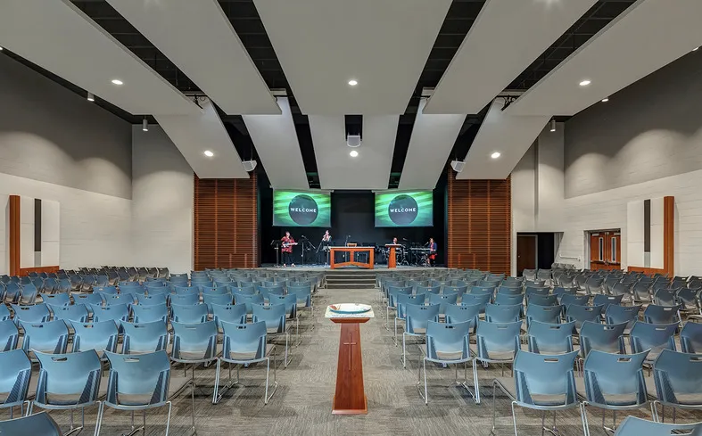The existing Rejoice Worship Center was completely renovated and features: a new acoustical cloud ceiling; a new stage area with integrated theatrical lighting, an inductive hearing loop system beneath the floor for the hearing impaired; and upgraded finishes throughout.